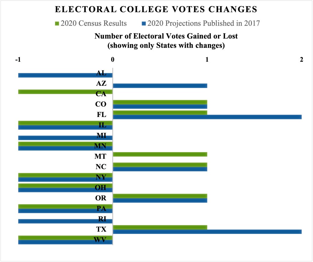 Now, what would happen if there were no census? The easiest answer is to use population projections. Advantageously, the advancement of statistical methods allows us to have better estimates that project demographic flows (fertility, mortality, and migration) in an increasing precise way. However, even high-quality projections differ from reality, and this distinction has concrete political effects. A difference between a projection and the result of the census can easily reconfigure the political structure of a country. That is what has happened with the latest results of the U.S. population census published on April 26, 2021; namely, in a country where its population projections benefit from high-quality administrative records. These results officially report the population distribution and its growth for each of the 50 States. Let’s see what happens if we compare these results with the 2020 population projections published in 2017. The following graph allows us to see this variation, showing significant differences between these two scenarios (Note: we only show those states where there is a change in the number of seats according to the variations in population).