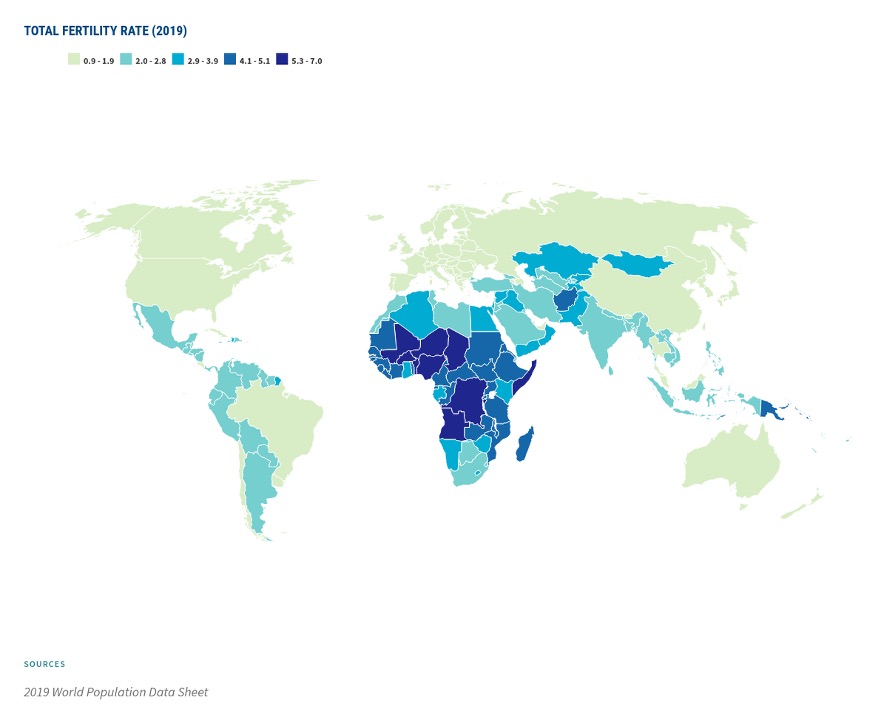América Latina entra en la recta final de la transición demográfica y se prepara así para la nueva era del envejecimiento. Tenemos ya tres países completamente envejecidos en la región: Cuba, Chile y Uruguay. Los más poblados están ya entrando en la fase de bajas tasas de mortalidad y fecundidad, que alcanza a los niveles de reemplazo en la mayor parte de la región y los últimos tres países que recién comienzan la fase avanzada de la transición demográfica son Bolivia, Haití y Guyana. De hecho, las tasas totales de fecundidad ya están por debajo de 3 hijos por mujer en prácticamente todos los países de la región, como lo muestran los datos del Population Reference Bureau – PRB en la Figura 1.