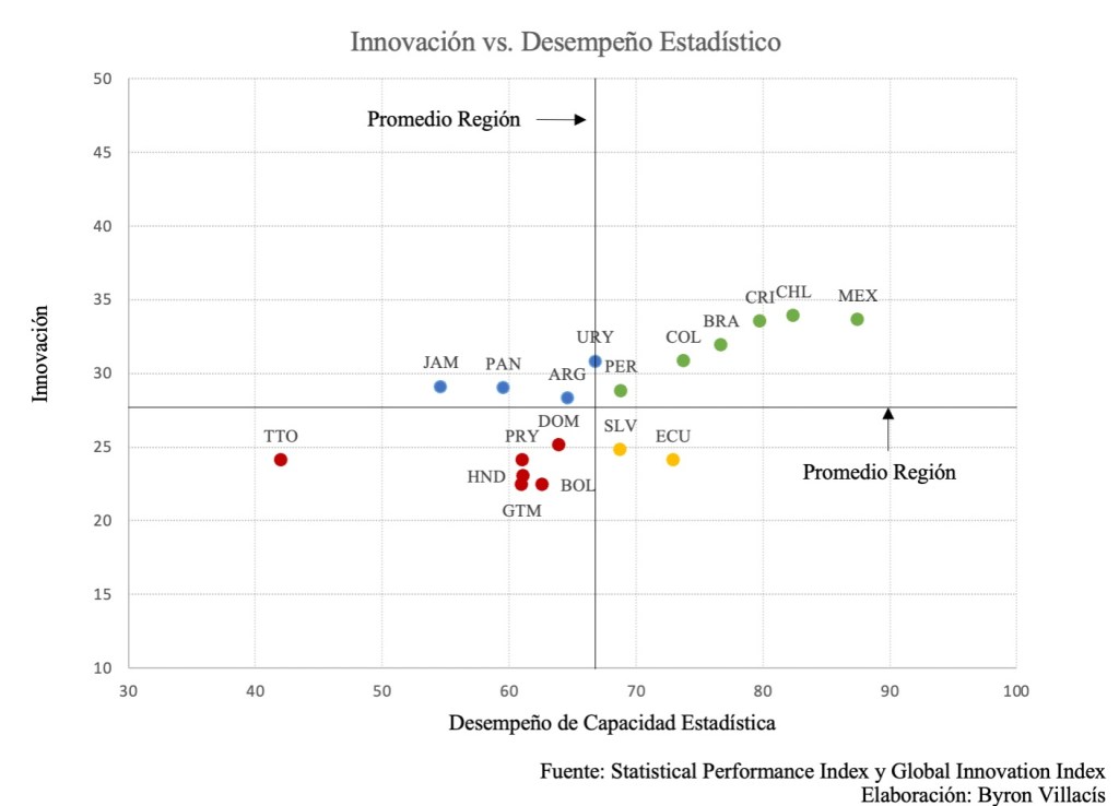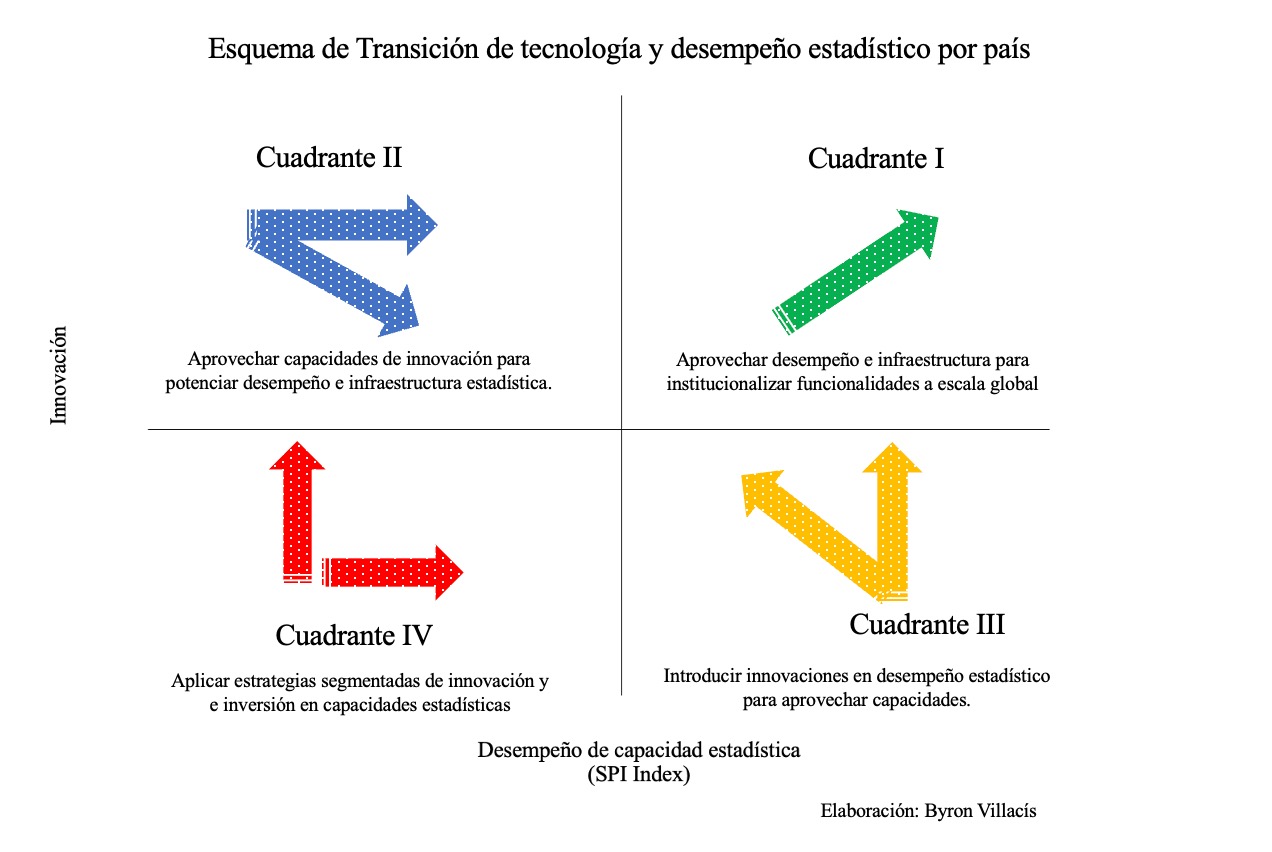 En el caso ecuatoriano, por ejemplo, los retos se centran en incrementar sus niveles de innovación para poder potenciar su nivel de capacidad estadística. Los casos de Panamá y Argentina ejemplifican la necesidad de aprovechar sus relativamente altos niveles de innovación para aplicarlos a su capacidad estadística. El caso de países como Guatemala o Bolivia implica una estrategia estructural que requiere apoyo de organismos tanto en innovación como en desempeño estadístico. Estas posiciones relativas permiten esquematizar un planteamiento estratégico de adopción de acuerdo al ecosistema estadístico de innovación: países en el Cuadrante I tienen el reto de mejorar sus procesos de acuerdo a estándares mundiales y de institucionalizar sus avances. Países en el Cuadrante II tienen el reto de aprovechar sus estructuras de innovación para aplicarlas sobre sus sistemas estadísticos. Países del Cuadrante III deberían promover innovaciones tecnológicas para aprovechar sus capacidades estadísticas, y países en el Cuadrante IV requieren una intervención segmentada basada en estrategias paralelas de innovación y mejora de desempeño estadístico.
