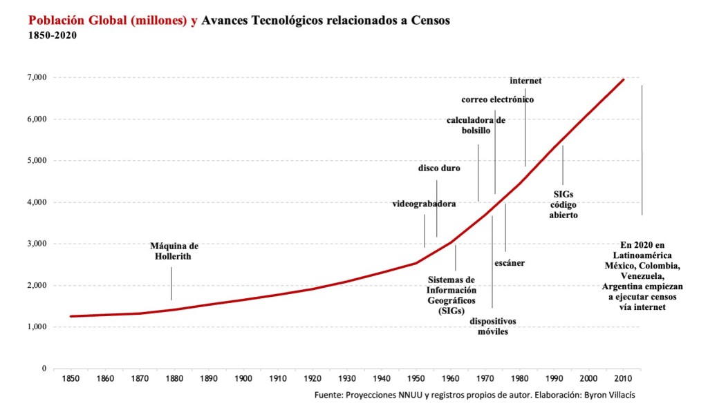 La adopción de tecnologías en un censo de población depende de la predisposición y capacidad institucional de implementar cambios de forma eficaz. A nivel histórico, los avances tecnológicos han contribuido en gran parte a mejorar la cobertura de los censos. Desde la llegada de la imprenta en el Siglo XV, pasando por el arribo de la máquina tabuladora de Hollerith en el Siglo XIX, hasta el acceso contemporáneo de internet a hogares, la tecnología ha presionado a que los censos se vuelvan más eficaces. Un ejemplo contemporáneo es cómo los censos de México, EEUU, Colombia, Venezuela y Argentina ejecutan (o ejecutaron), aunque sea parcialmente, sus censos de la ronda 2020 a través del internet. Esto les permite ahorrar costos y evadir riesgos logísticos de las operaciones tradicionales. En la gráfica No.1 se puede observar la evolución de la población a nivel global y una selección de aparición de tecnologías que resultaron determinantes en la ejecución de censos.