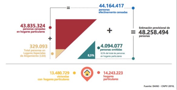 El DANE (Departamento Administrativo Nacional de Estadística) acaba de entregar los resultados del XVIII censo de población y VII de vivienda realizado en el 2018. La entrega de resultados ha sido parcial puesto que existen reportes, infografías e ilustraciones de los resultados; sin embargo se anunció que la base de datos aún no estará disponible. Los resultados, en términos generales, no causan sorpresa: Colombia tiene 48’258.494 millones de personas, el 68,2% esta entre 15 y 65 años de edad, el 51% son mujeres, los hogares tienen en promedio 3,08 integrantes y el 41% de los mismos tienen como jefatura de hogar una mujer. Ud. puede acceder a un resumen sobre la situación poblacional aquí, a la geográfica aquí o a la de condiciones de vida aquí. El observatorio realizará análisis más profundos respecto a los resultados; sin embargo, por el momento nos concentramos en mostrar información relevante respecto al operativo censal.